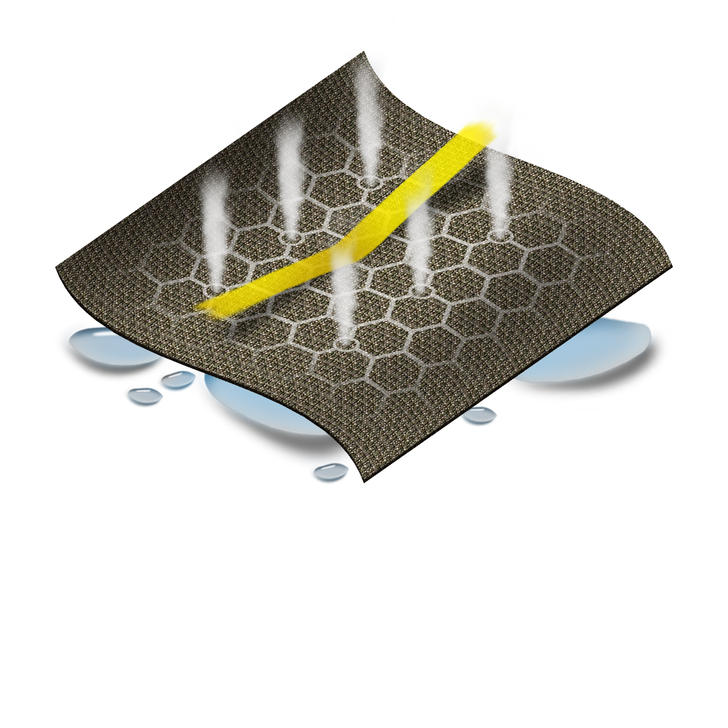 First, Ultra-durable 4-way stretch HYDRAFUSE™ SCRAPEarmour™ fabric is placed on the backside for high abrasion resistance.