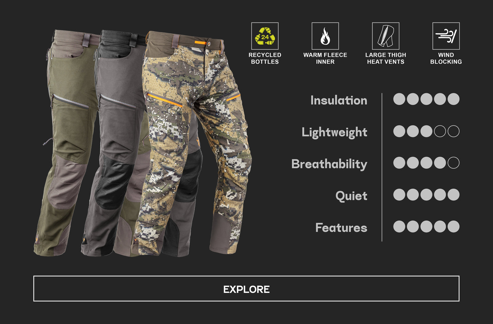The Hunters Element range is based on a 3-layer system: base layer, mid-layer and outer layer. These mid-layers are designed to be worn above our base-layers (such as the Core or Core+ range) and underneath our outer-layer pants which are designed to withstand extreme elements (such as our Odyssey Pants V2, Downpour Elite Trouser, or Atlas Pants).