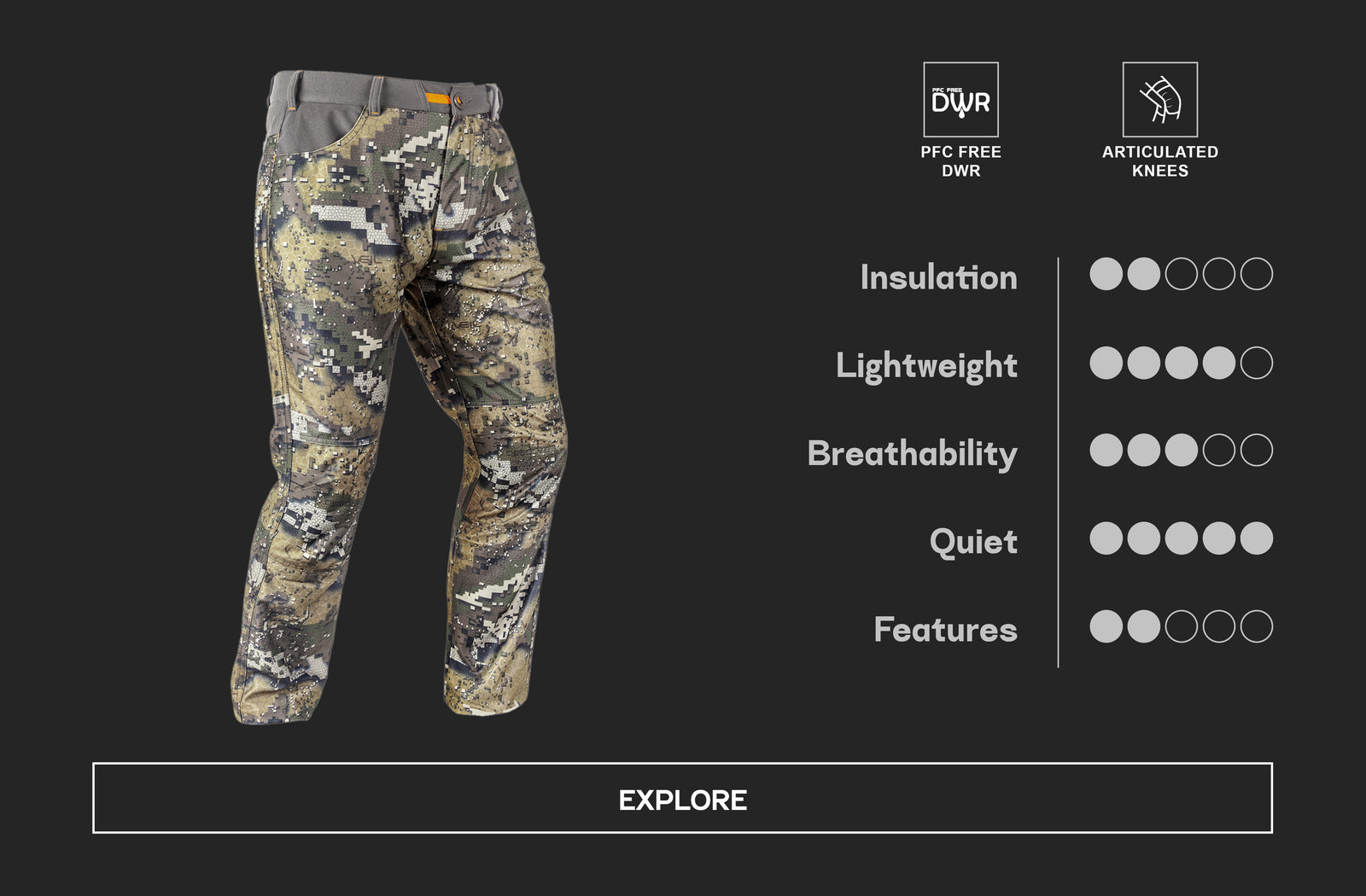 Light hunting pants that excel year round. They breathe well to remain comfortable in hot conditions and can be paired with CORE+ leggings to insulate you in the winter. Super comfortable, lightweight, ultra-breathable, and packed with features. A body-mapped design utilises ScrapeArmour™ fabric on the knees, seat and ankle gussets for added durability.
