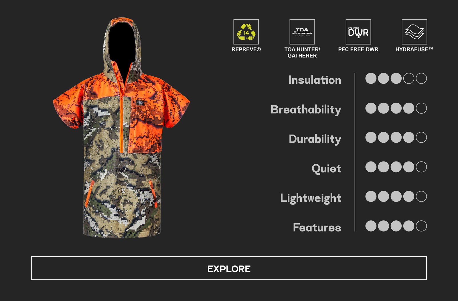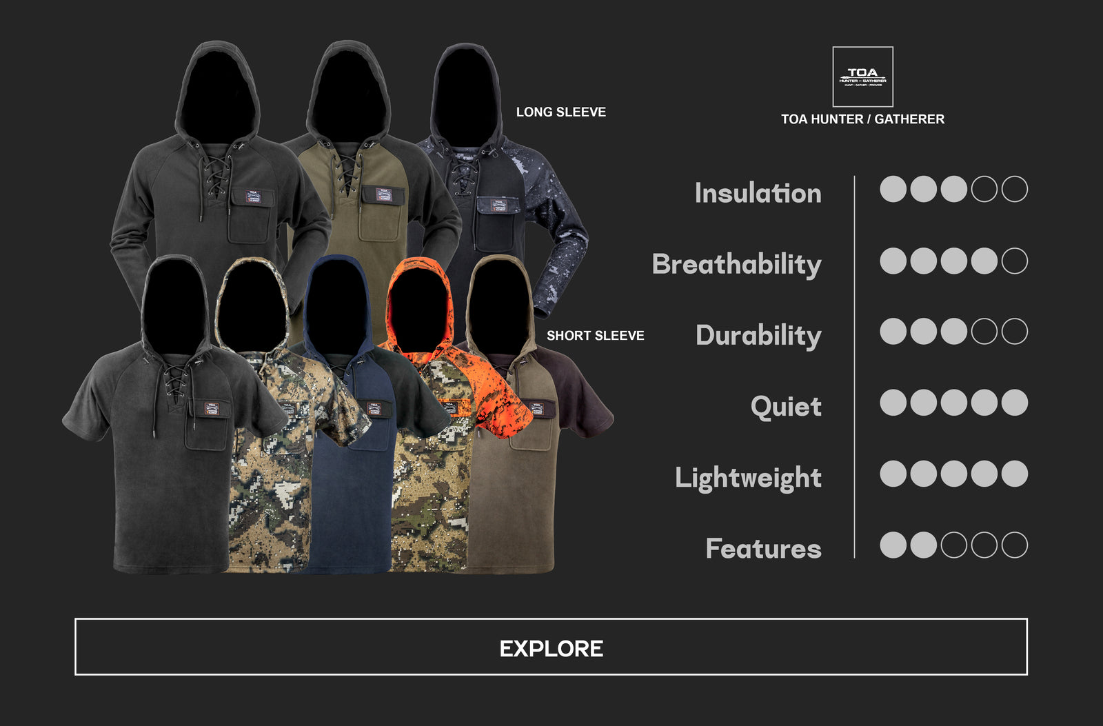 The Whakarapu Hoods from the TOA Hunter-Gatherer range are long, warm, and lightweight but still tough as. The features and design draw inspiration from TOA's values of respecting tradition, seeking challenges, and being a guardian of our natural environment.