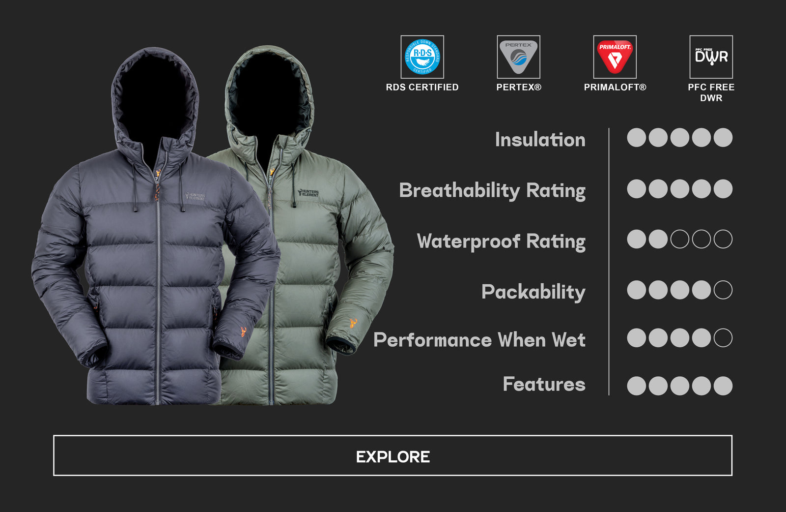 All DWR used in the Hunters Element range is PFC free, and you can read more about our choice to use this type of PFC free DWR here.