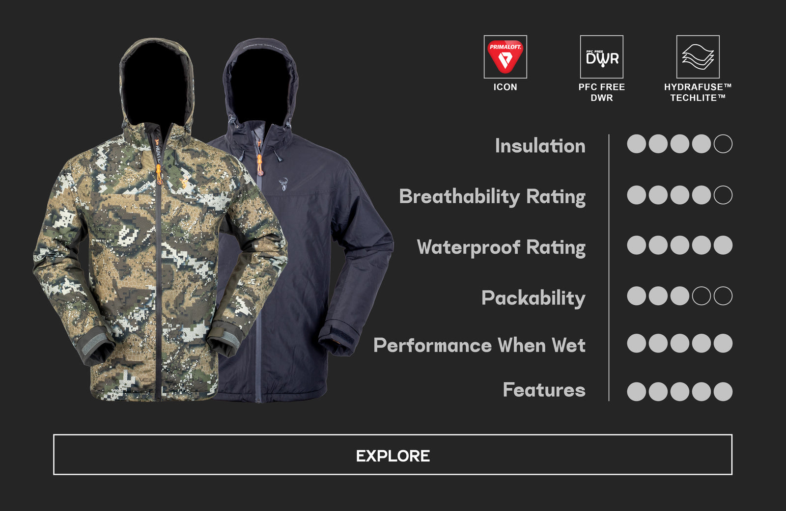 PRIMALOFT® is a leading brand of synthetic down fill, and the Glacier Jacket uses a blend of RDS certified natural down and the PRIMALOFT® Silver down – combining the benefits of synthetic and natural down. Our Sleet Jacket has a PRIMALOFT® Gold down insulation.