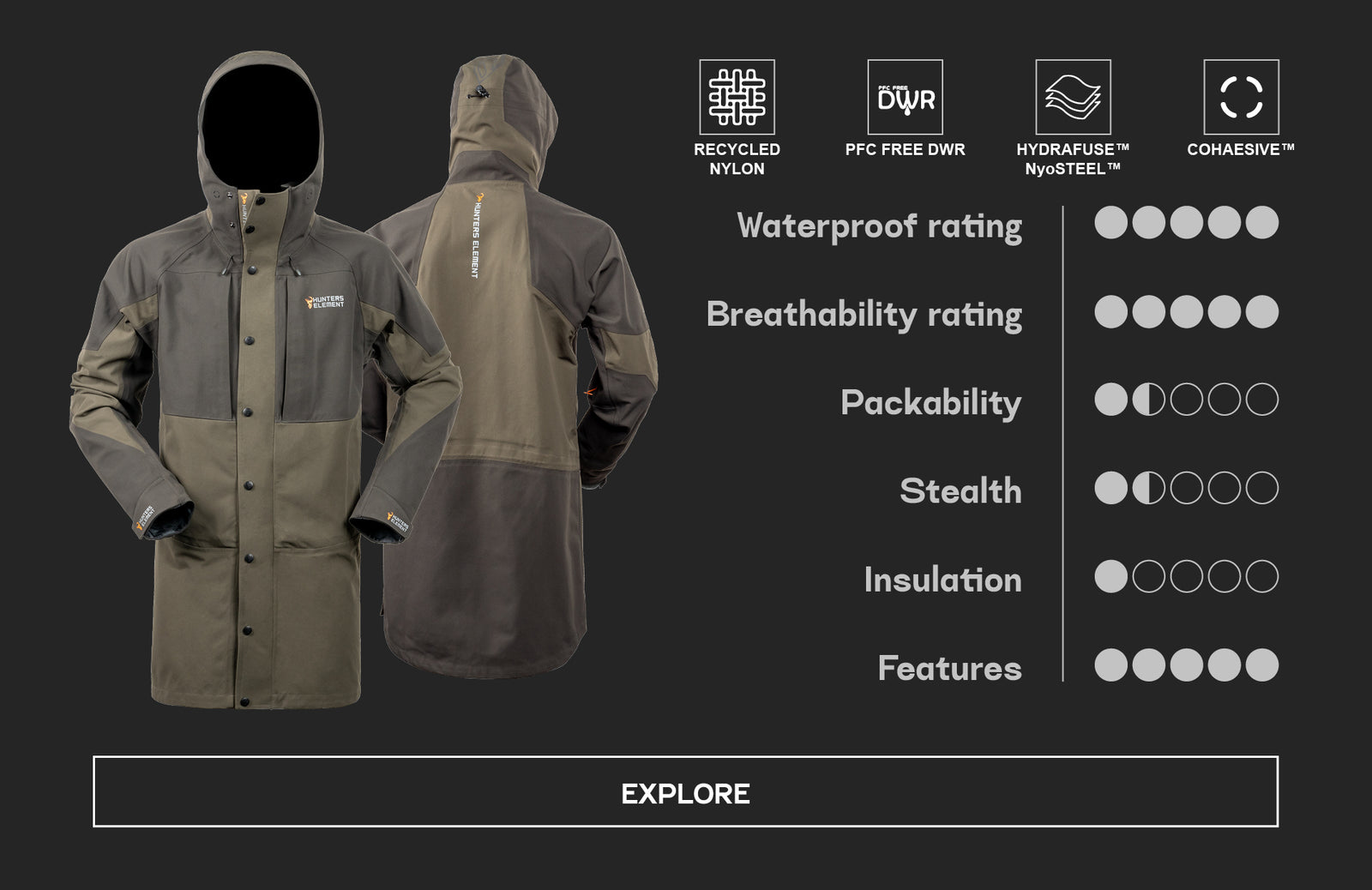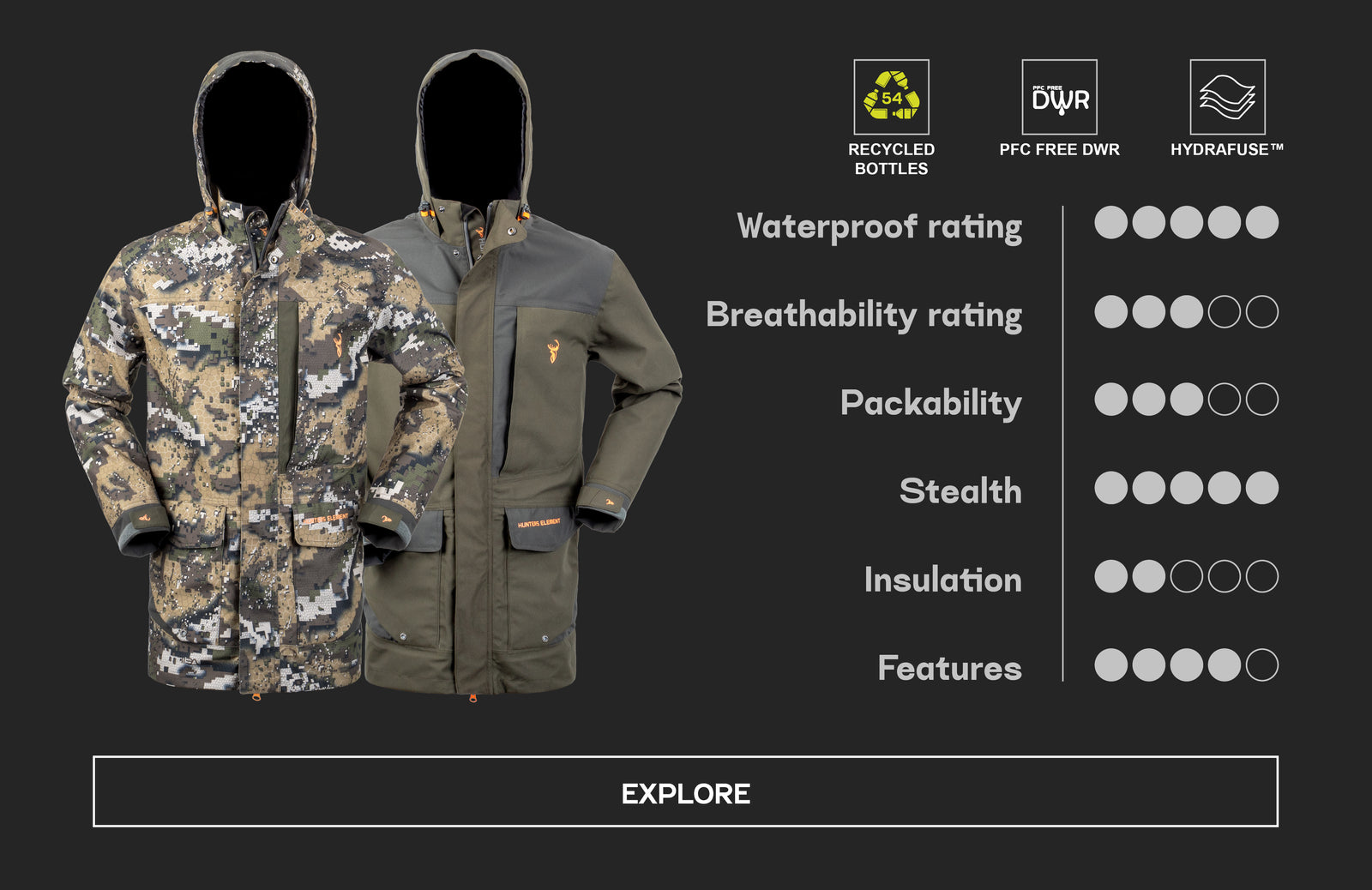 The Hunters Element range is based on a 3-layer system: base layer, mid-layer and outer layer. These outer layers are designed to be worn above our base-layers (such as the Core or Core+ range) and our mid-layer range (such as the Legacy Jacket, Zenith top or Whakarapu Hood).