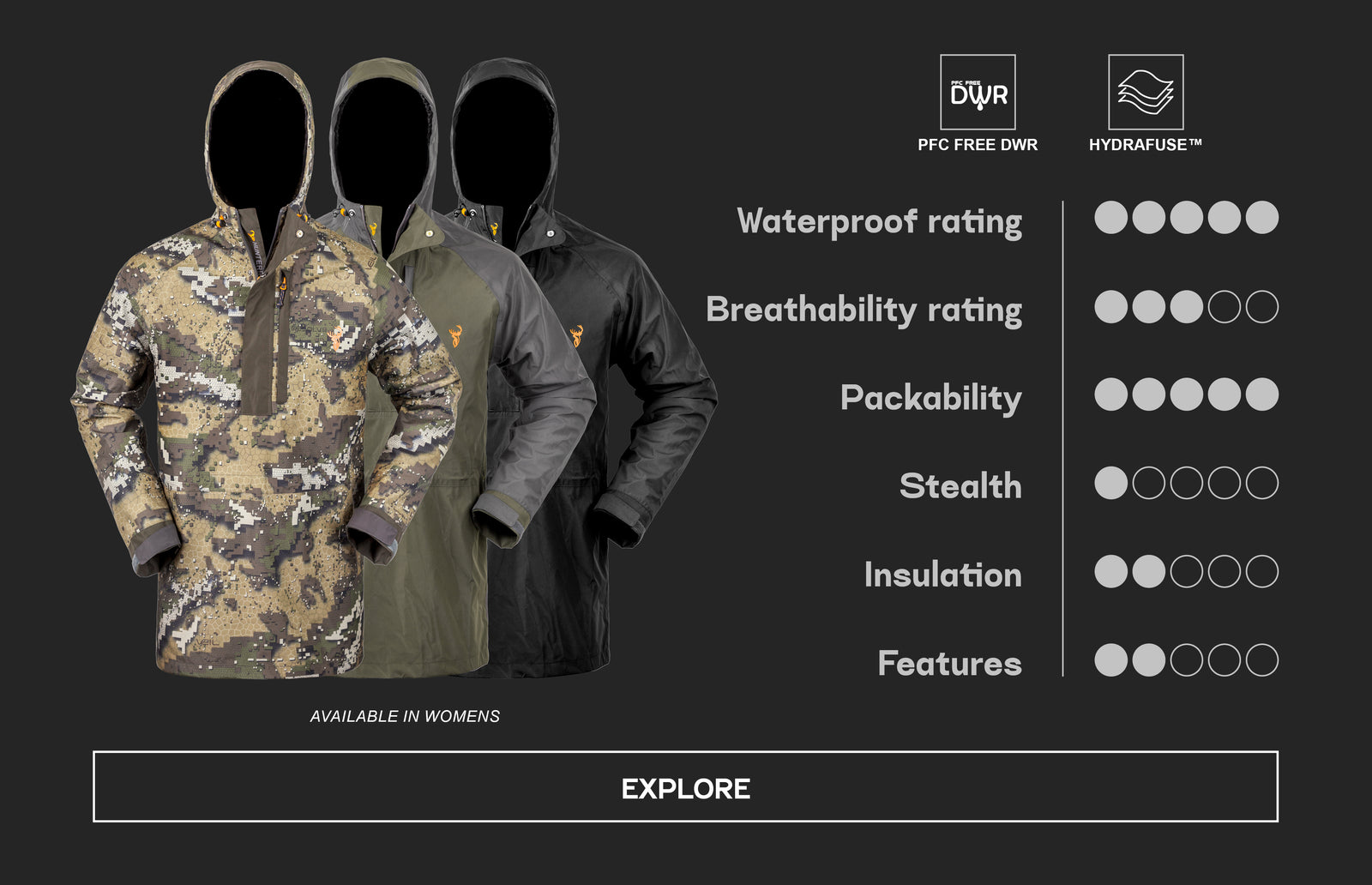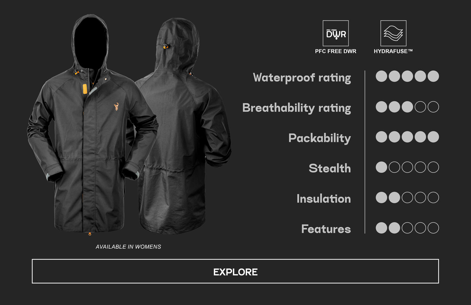 All DWR used in the Hunters Element range is PFC free, and you can read more about our choice to use this type of PFC free DWR here.