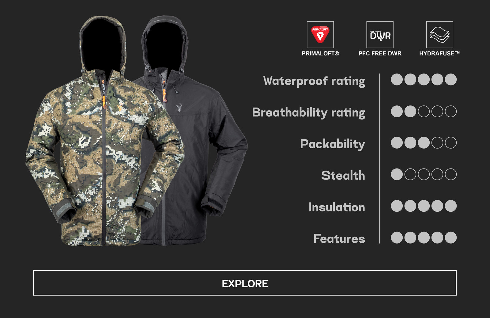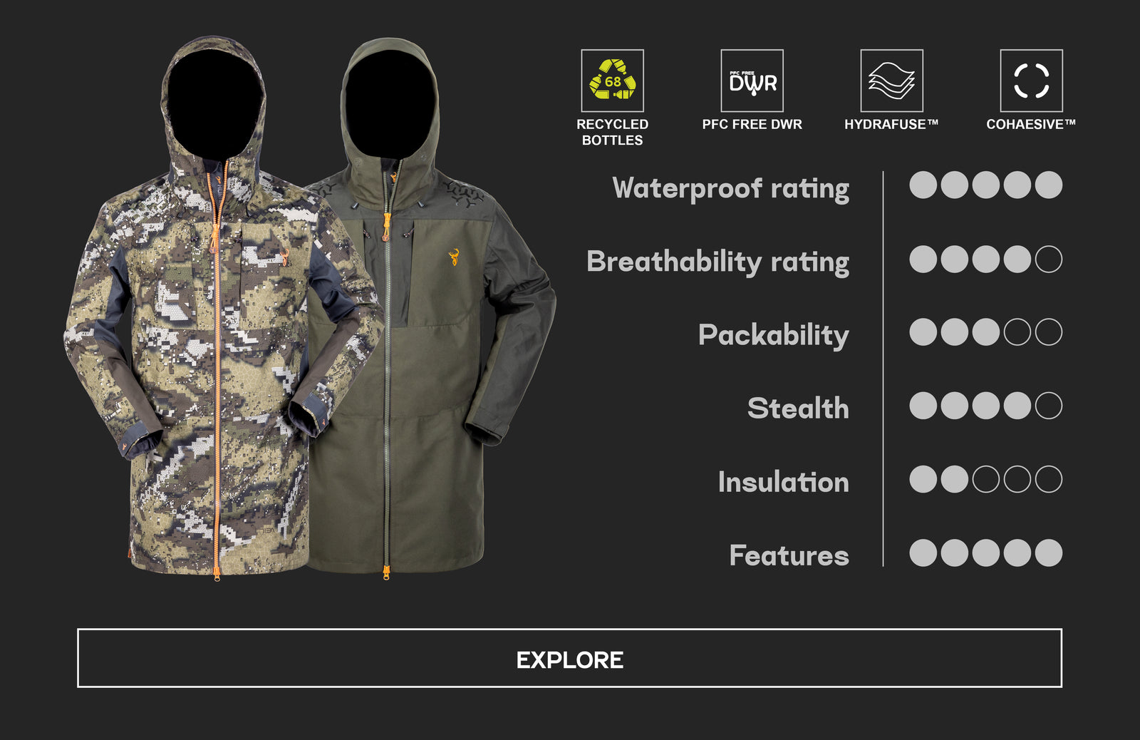 Our range of barrier layers all serve two key functions; 1. Block out all nasty rain, blood and snow, and 2. Expel the uncomfortable moisture build up. From there, things get a bit more complicated. Different hunts and hikes have unique requirements, such as maximising durability, stealth, packability, or insulation.