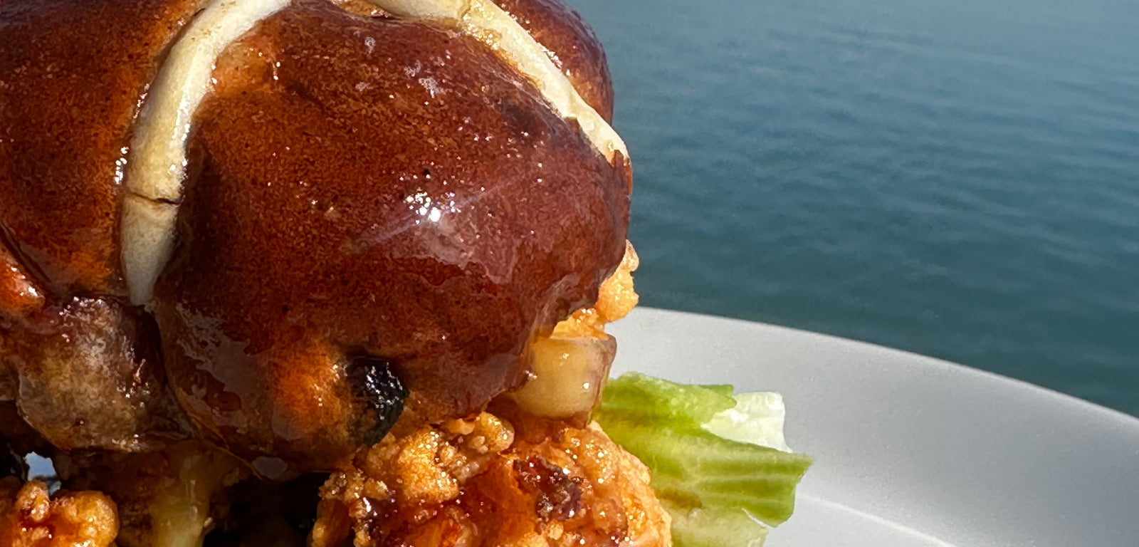 Crispy, golden rabbit, smoky cheddar, pickles and maple syrup stacked inside a toasted hot cross bun.