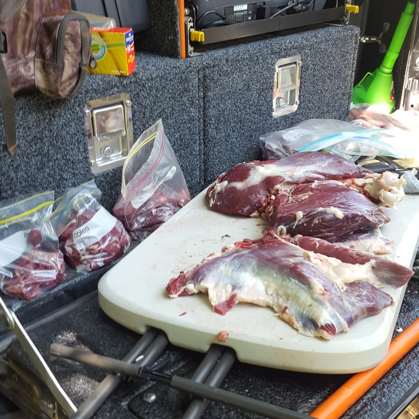 I took three spikers and harvested much more meat than I could use or store, but I took all the proceeds back to the campground and distributed as much of it as I could. I scored a freezer full of meat, a few more skins, and even received a dozen free-range eggs from another camper.