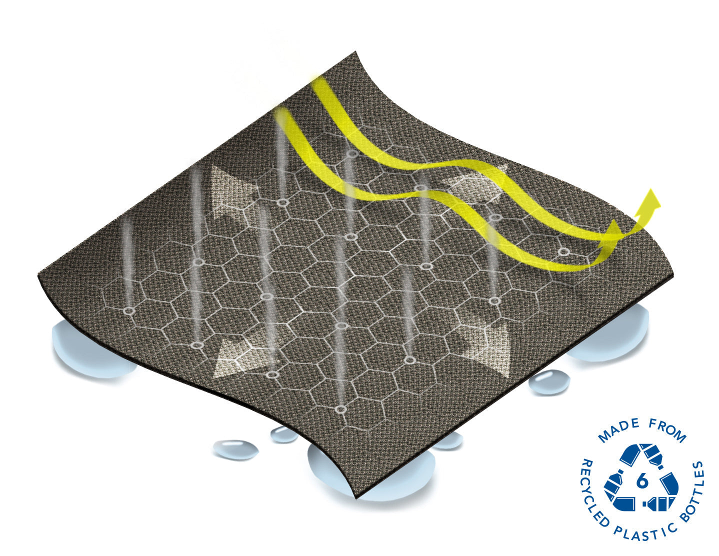 HYDRAFUSE™ Helios is an ultra-light, durable and breathable polyester fabric designed for sun and sweat. This new-age, four-way stretch material is constructed with a knitting method that creates micro-channels that rapidly pull perspiration away from the skin and drive it to the outside, where freely passing air quickly dries things off. Made from recycled polyester (RPET), this UPF30+ fabric sets the benchmark for the future of high-performance summer base layers.